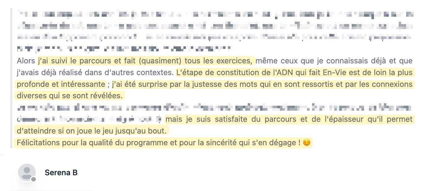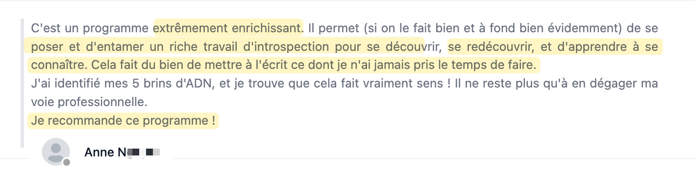 Oui, parce que tu ne vas pas chercher des réponses en dehors de toi. Tu vas les faire émerger de toi. Le programme est construit comme un fil rouge : chaque étape te rapproche de plus en plus de ce qui fait sens pour toi.