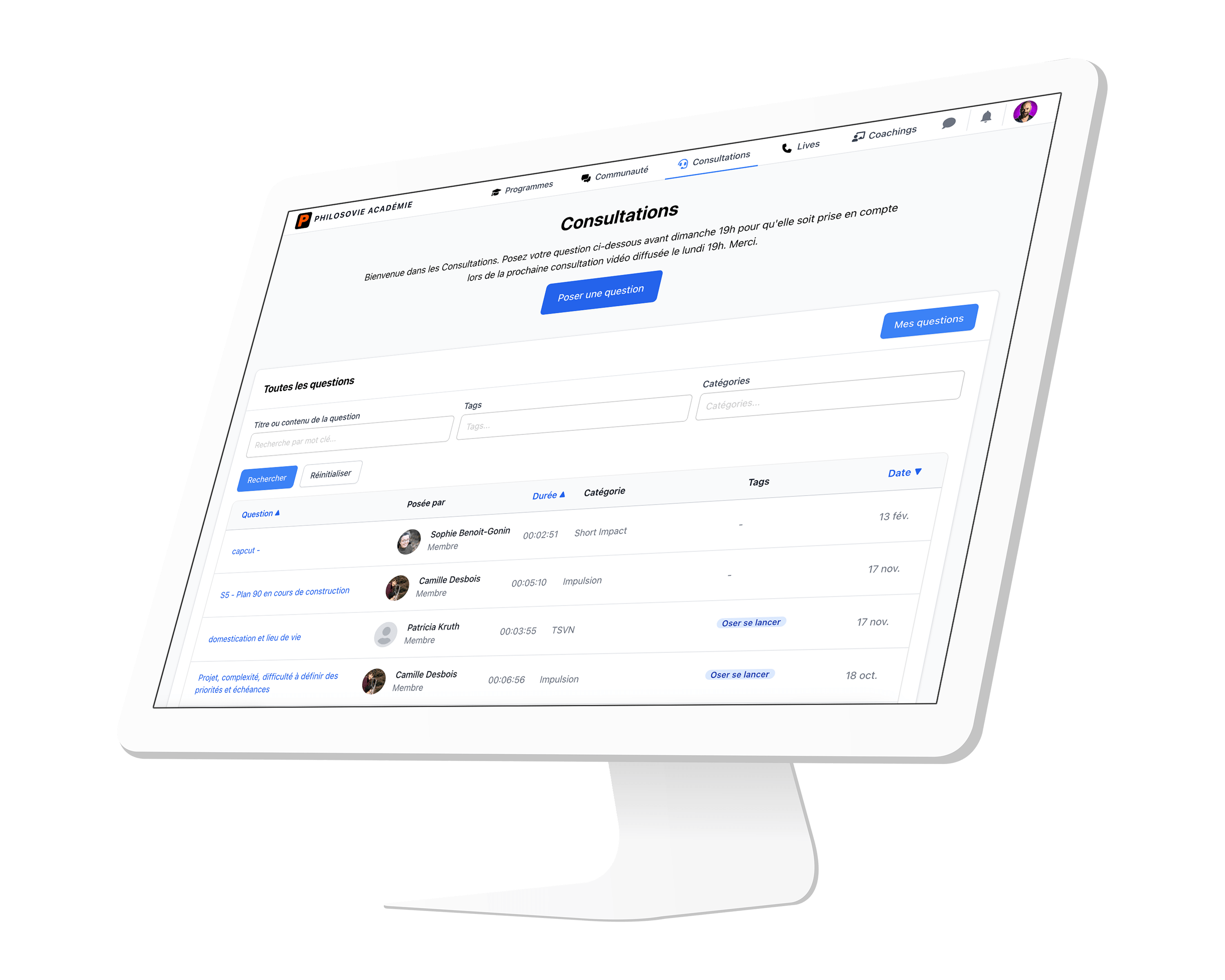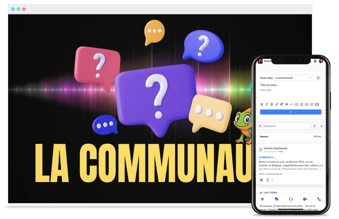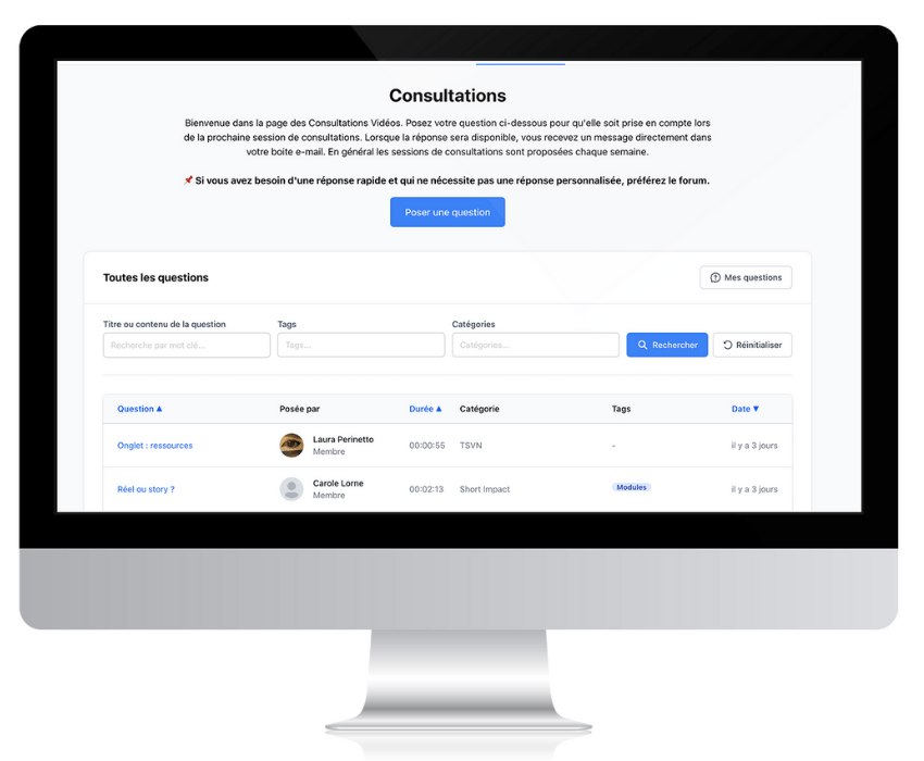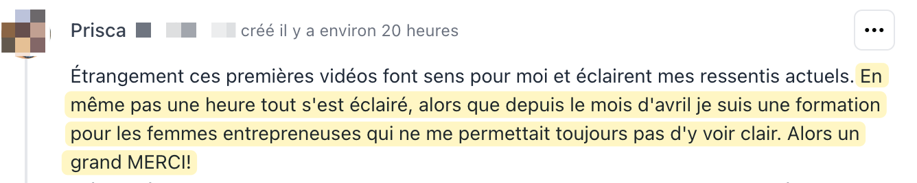 Tu poses ta question à l’écrit dans ton espace membre, et tu reçois une réponse personnalisée en vidéo dans les jours qui suivent. Positionnement, posture, message, doutes, offres : tout est bienvenu. Une sorte de mini-coaching à la demande, pour t’aider à avancer avec clarté et confiance.