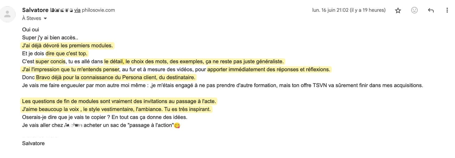 Tu peux me contacter. Tu as accès à mon mail privé pour poser toutes tes questions. Et si tu veux aller plus loin, tu peux aussi opter pour un pack d’accompagnement en option. Mais rien n’est forcé.