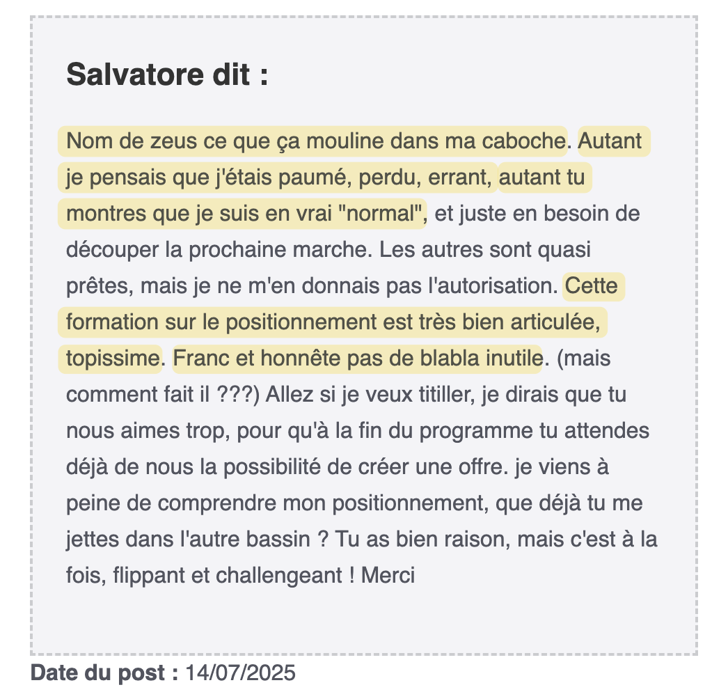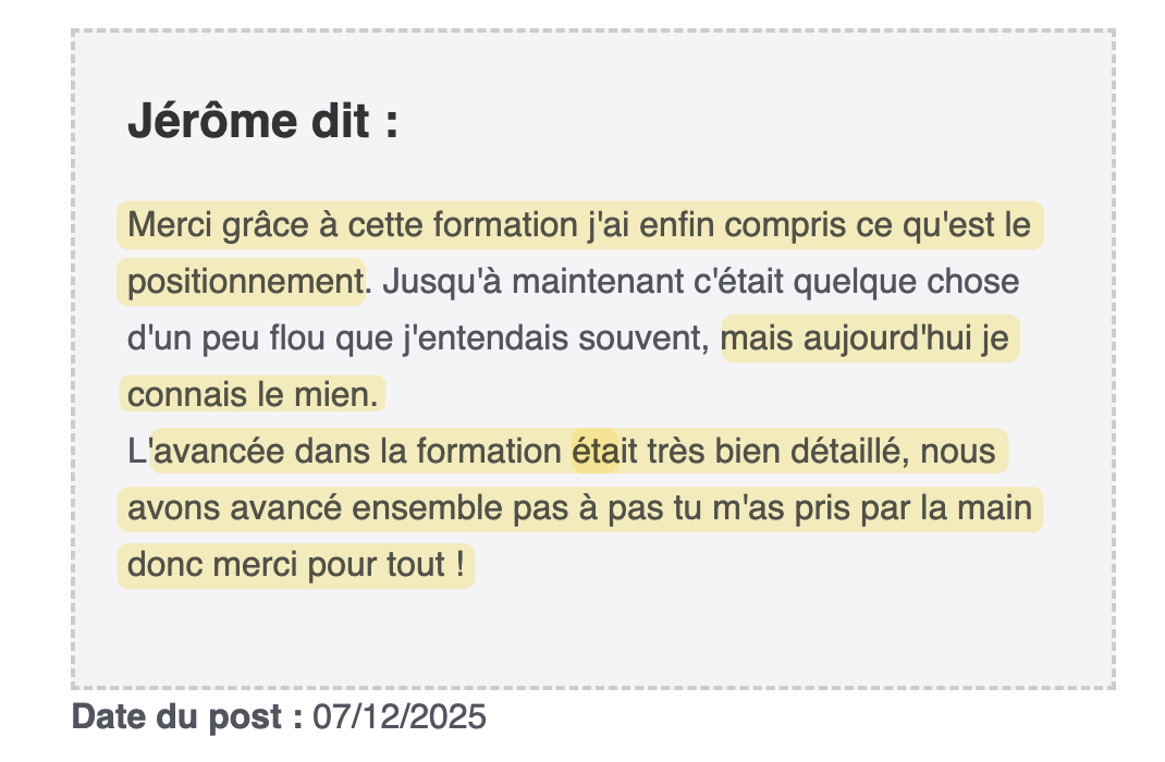 Pas du tout. Tu vas surtout apprendre à poser un message vivant, clair, incarné. Pas un slogan marketé, mais un message que tu peux porter avec fierté — à l’écrit comme à l’oral. Et surtout, un positionnement qui te ressemble vraiment.