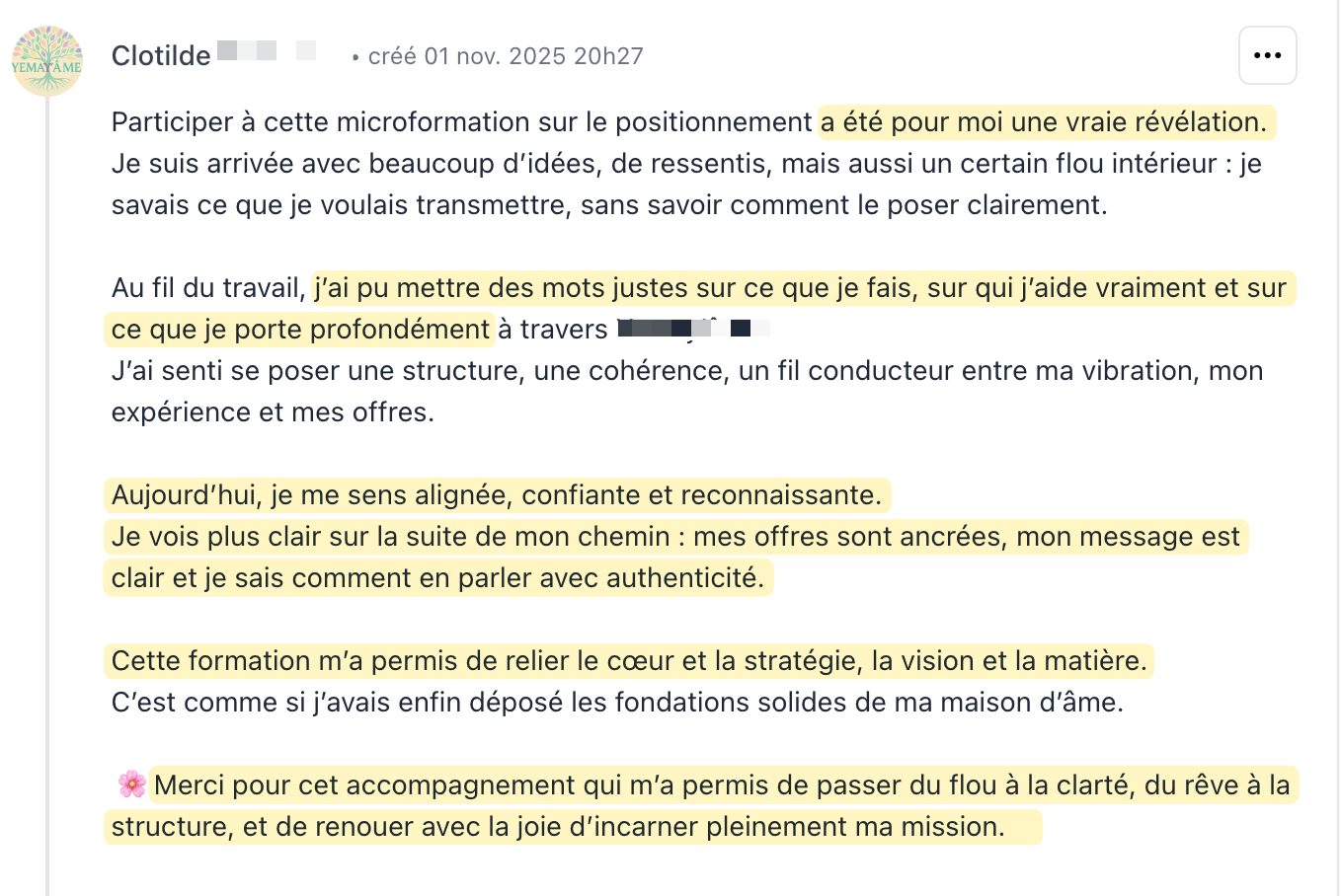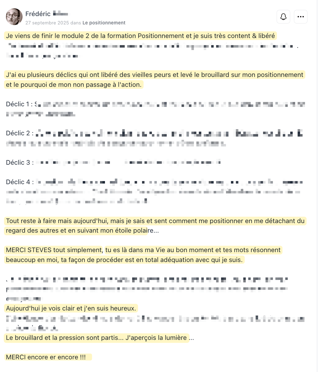C’est en travaillant sur ce que j’appelle aujourd’hui le positionnement vivant – aligné avec ce que tu es et lisible pour le marché – que tout a changé. J’ai pu structurer un écosystème sur-mesure, assumer ce que je portais, créer des offres spécifiques sans me sentir enfermé.